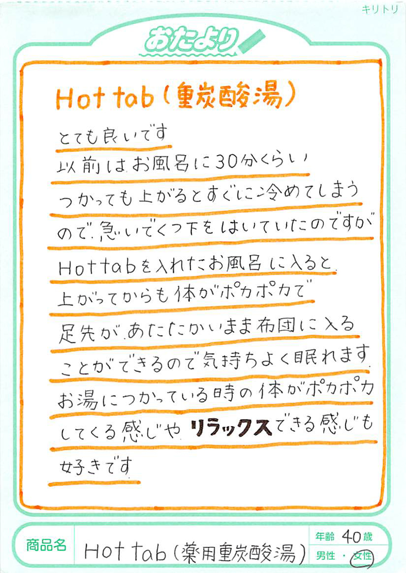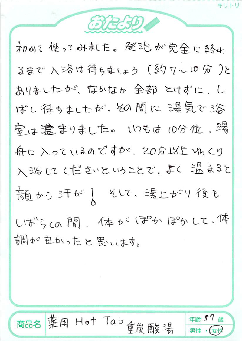 ぬるめのお湯(38~39度)に「重炭酸湯」を3~ 4 錠入れます。血流が高まるのは入浴後10分以降ですので、20分を目安に長めにゆっくりと入浴しましょう。足湯もおすすめです。お湯を足しながら20~30分、からだ全体がポカポカになります。