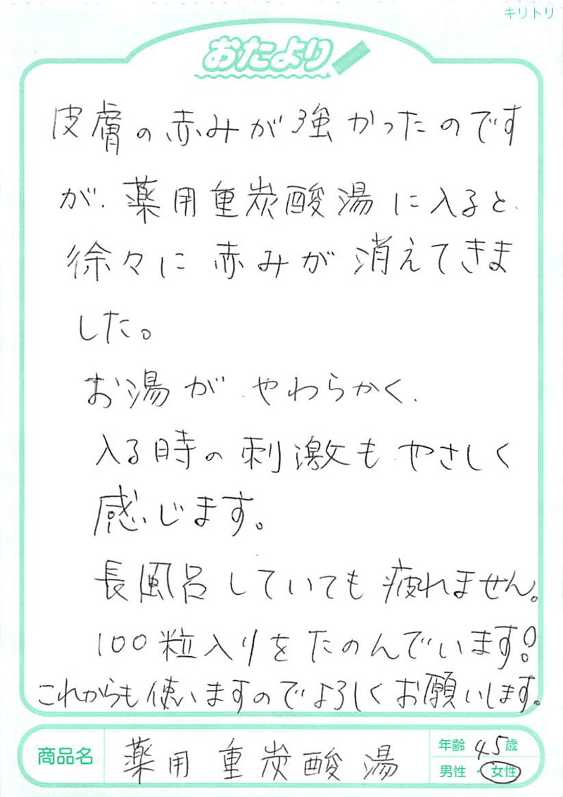 重炭酸による効果は、体を温めるだけではありません。水道水中のカルキ(塩素)を中和させるので、お湯が柔らかくなり、アトピー肌にも優しい浴湯となります。ぬるめのお湯でも血流を促がす重炭酸イオンが含まれていれば、15分程度で体が温まります。冷え性を解消し、アトピー症状を緩和するためにも、お勧めのアイテムです。