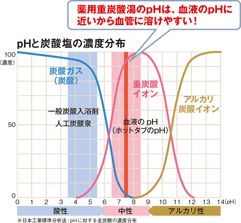 従来の、お風呂に入れて発泡するタイプの炭酸ガス入浴剤は、数分で空気中に拡散してしまうため、血管を拡げることで血流を良くする重炭酸イオンは浴湯内にわずかしか発生しませんでした。
