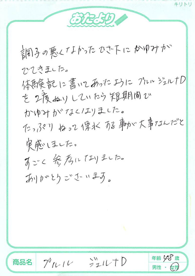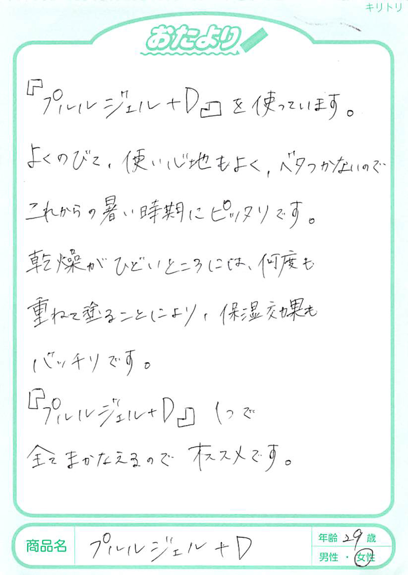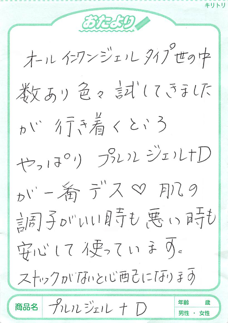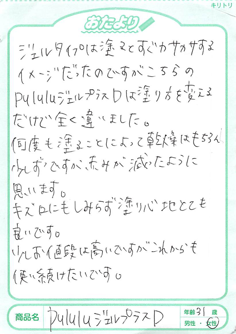 乾燥、赤み、そしてかなり湿疹がひどかったのですが、一日二回、プルルジェルの二度塗りを、とにかくたっぷりしました。(ご利用者の声)