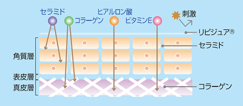 リピジュア®は、高保水膜をつくって皮膚の柔軟性を向上させ、しっとりしたスベスベ肌に導きます。セラミドは角質層に届き、角質細胞間脂質として皮膚のバリア機能を強化。ヒアルロン酸、コラーゲンなどは真皮層でうるおいや弾力を保ちます。