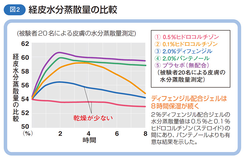 皮膚が乾燥することによっても、皮膚はかゆみが起きやすくなります。ディフェンジルによるスキンケアで、皮膚の水分が失われる量(経皮水分蒸散量※)が大幅に減ることがわかりました(図2)。