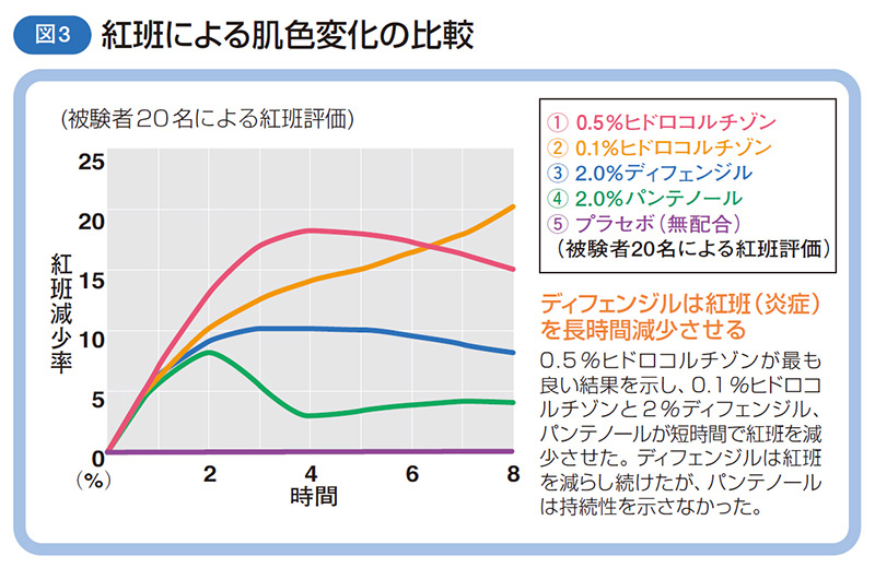 その結果、④⑤は2時間で元の状態に戻りましたが、①③は8時間後でも塗布した状態を維持し、皮膚の乾燥を防ぎました。特に、③のディフェンジルは、②の薄い濃度(0.1%)のステロイド剤よりも優れた値を示し、①の濃い濃度(0.5%)のステロイド剤と、ほぼ同等の値を示しました。