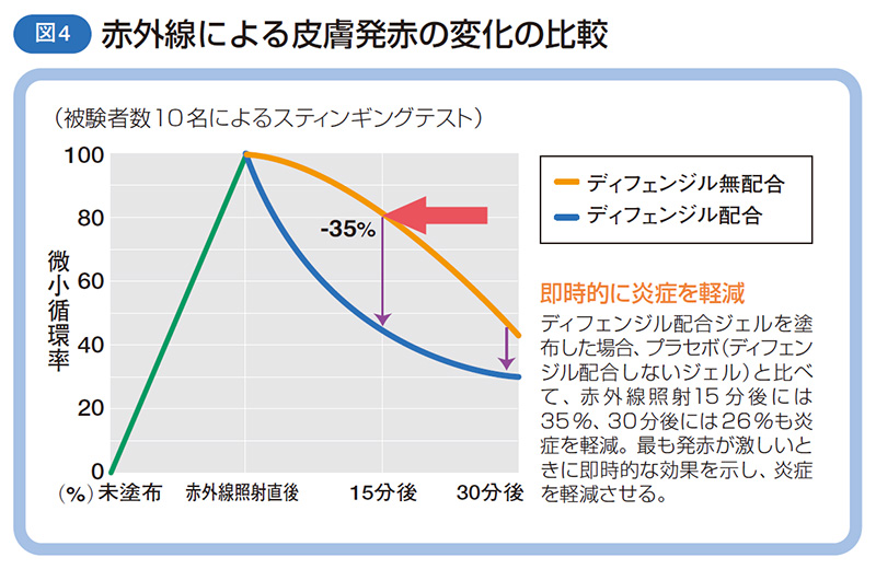 図1の臨床試験では、5%のディフェンジルを含んだジェルを用いて、9名の過敏症の被験者に、肌の刺激反応を調べるテスト(スティンギングテスト※)を行った結果、28日使用後で、肌の刺激反応が平均で64%も減少しました。うち2名については、完全に肌に対する刺激反応がなくなりました。