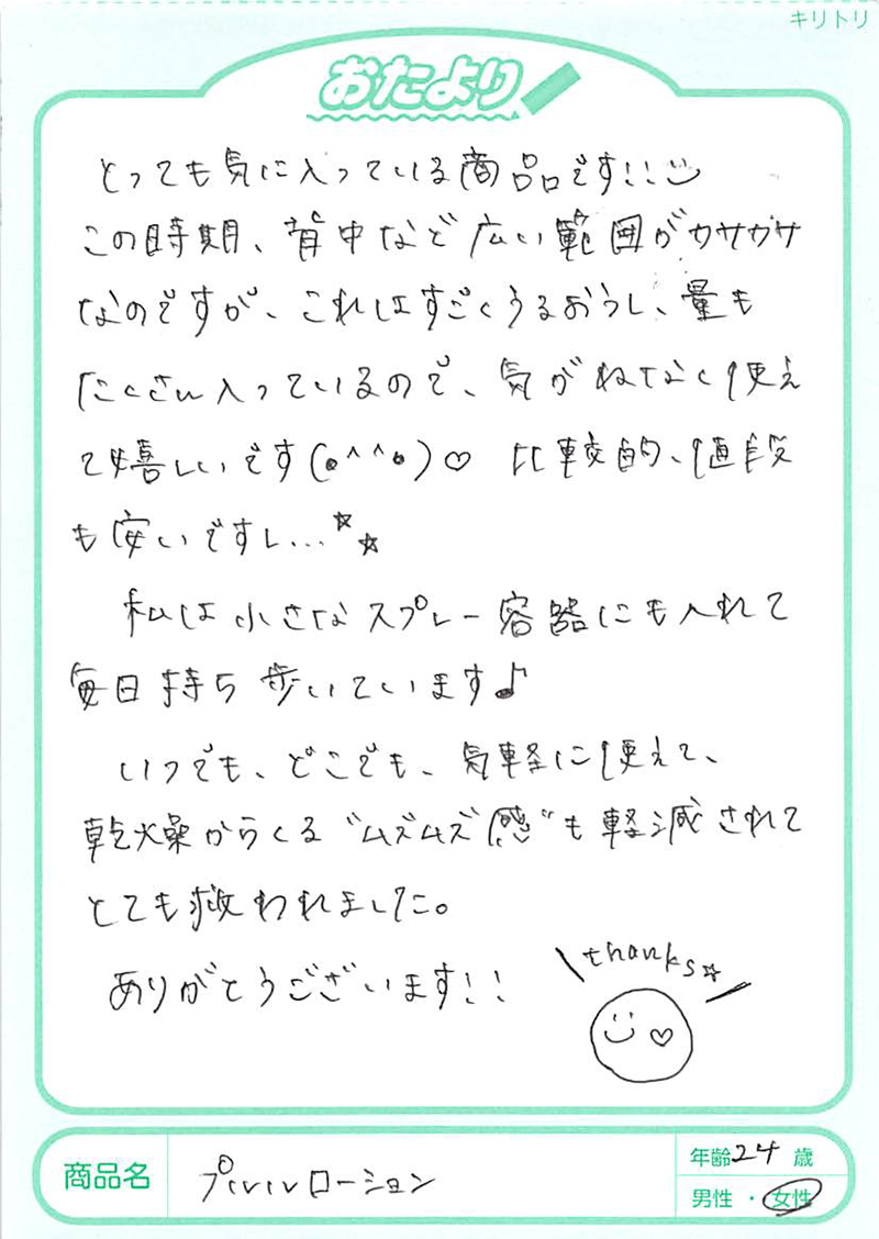 スプレー式なので、乾燥などの気になる部分に吹き付けてください。ミストが広がって、手早く保水ができます。