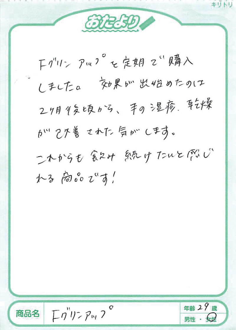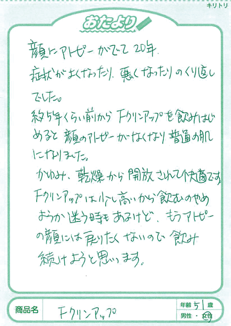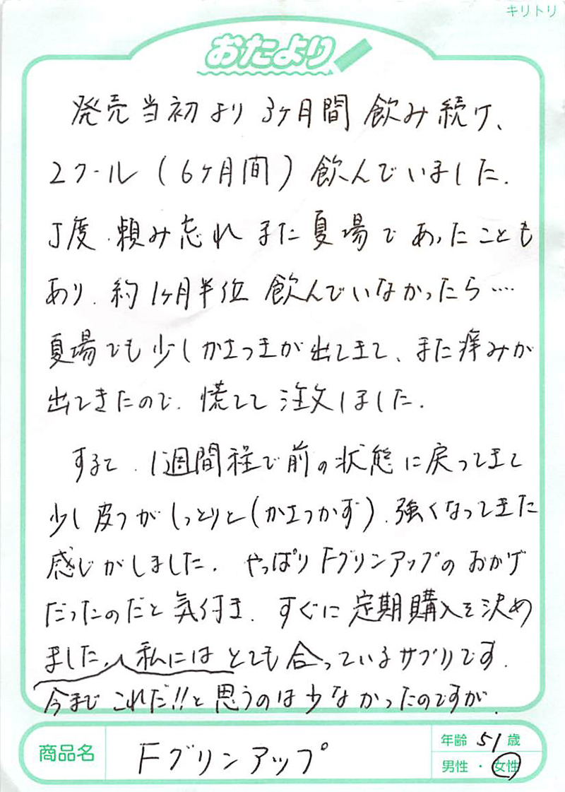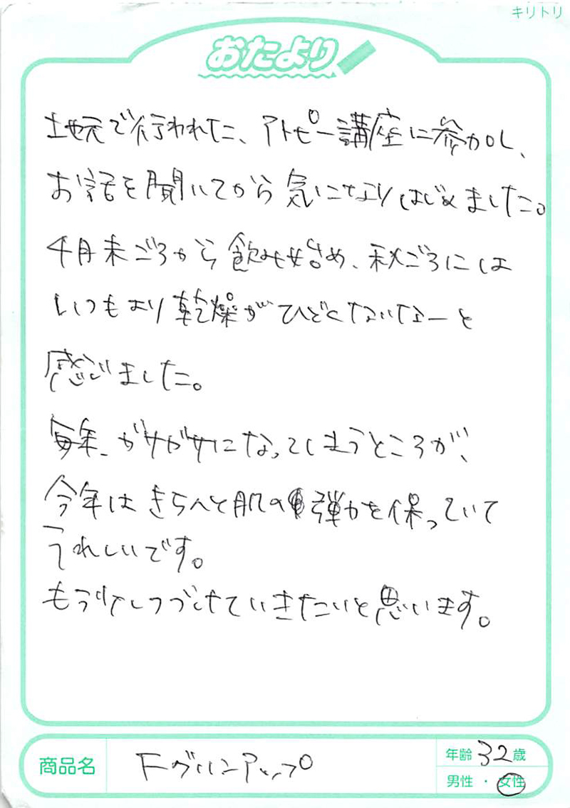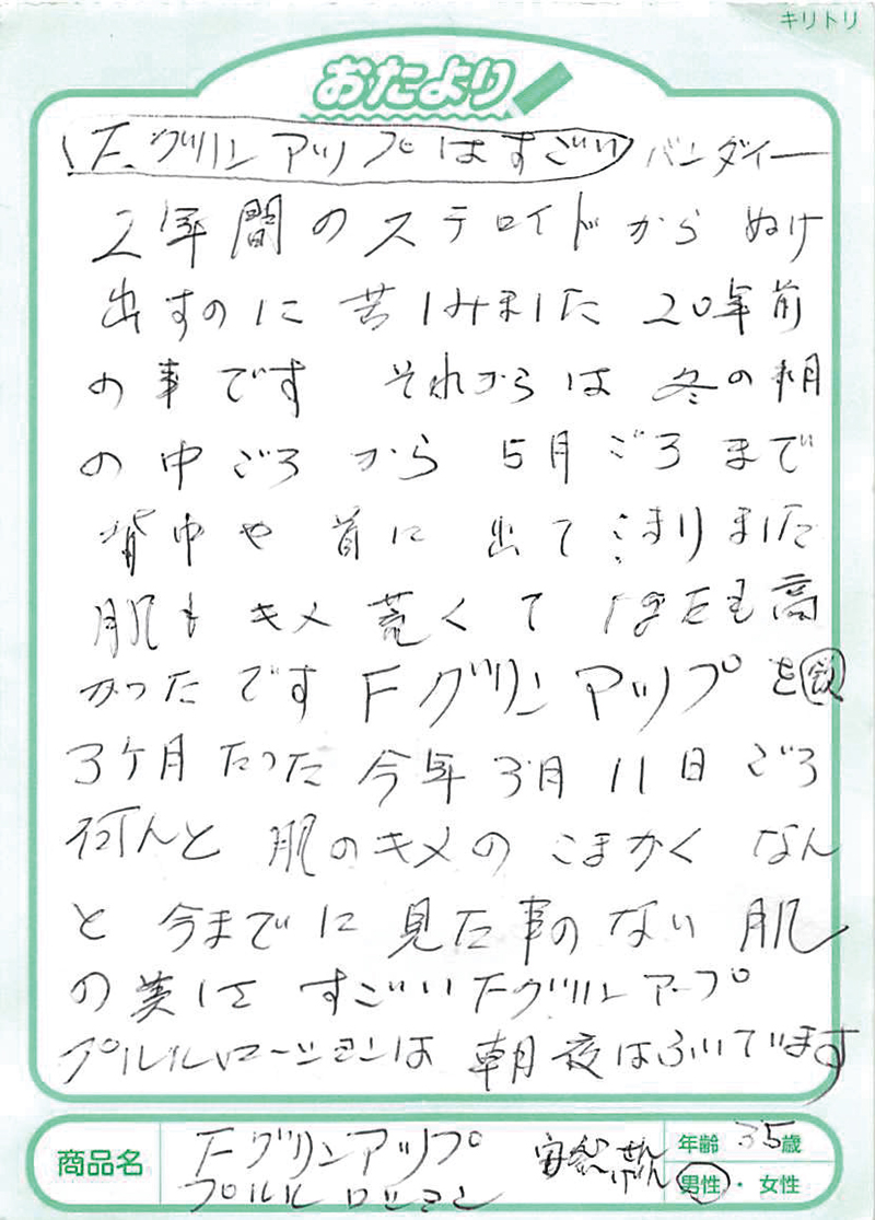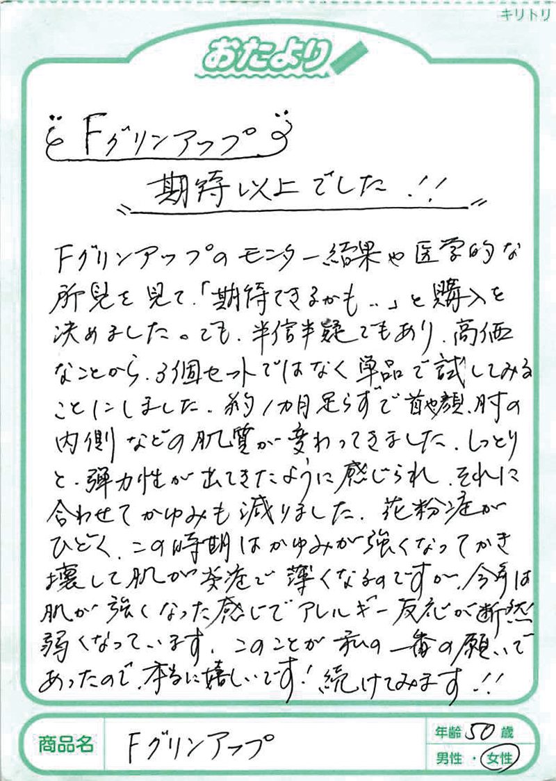 アトピー性皮膚炎の方にフィラグリンが少ないことは2013年に京都大学が発表していました。このフィラグリンについては、欧米の研究でかなり前から肌トラブルに関係していることがいわれていましたが、日本大学の桑原正人先生は、犬のアトピー性皮膚炎の研究からフィラグリンの減少、そしてヘルパーT細胞のⅢ型(Th3)へのアプローチが大切であることを突き止めておられました。1,000例以上の犬のアトピーへの研究を、その後、ヒトにも応用して生まれたのがFグリンアップです。